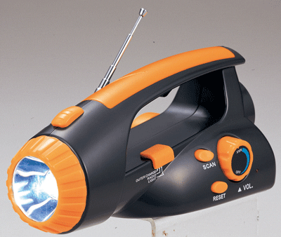 災害時に役立つFMラジオつきライト。手動で蓄電でき、1分間の充電でライトが約10分間、 ラジオが約6分間使えます。サイズ:90×177×80mm